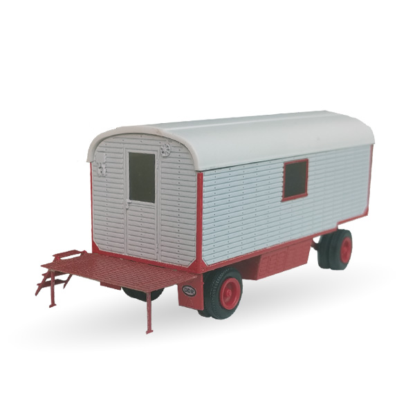 Das Vorbild dieser Ausführung der vielen Wohn- und Mannschaftswagen des DDR Staatszirkus ist der Wohnwagen von Ursula Böttcher. Dieser Wohnwagen gehörte zum Fuhrpark mit dem sie mit ihrer Eisbärentruppe in vielen Engagements auf der ganzen Welt unterwegs war. Der im Original etwa 6 m lange Wagen ist mit vielen Details ausgestattet. So finden sich die Lüftungsgitter, Stromanschlüsse und Türklinke am Heck des Wagens. Die Fenster sind so konstruiert, dass diese vor der Montage separat lackiert werden können. Eine Antenne inklusive passender Halterung findet sich an der Front des Wagens. Im Heck ist eine Veranda mit Treppe angebracht. Die Veranda kann aber auch am Wagenheck verbaut werden und die Treppe an der Front eingehangen werden um den Wagen im Transport darzustellen. Ein toller Wagen, der mit der Eisbärengruppe nicht nur im DDR Staatszirkus, sondern auch beim Circus Busch-Roland, Knie und vielen anderen weltweit unterwegs war.