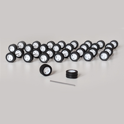 Set mit 16 kompletten Radsätzen in 1:87 aus Kunststoff. Die Radsätze eignen sich bestens für die Bereifung von Circus- und Kirmeswagen mit etwas größeren Rädern, wie diese oft in der DDR anzutreffen waren. Hervorragend geeignet daher für die Bereifung der Wagen des DDR Staatszirkus oder Kirmeswagen von z.B. Pfaff. Die Reifen haben einem Durchmesser von ca. 10mm. Das gesamte Set besteht aus 32 Felgen, 64 Reifen und 16 Stahlachsen. Die Radsätze sind eine passende Ergänzung für alle Modellbauer, die Circus oder Kirmes Wagen gerne selber bauen oder umbauen.