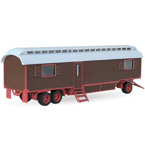 Unlackierter Messing-Bausatz eines Pfaff Oberlichtwagens inkl. Fahrgestell, Radsätzen, Treppe und Kunststoff-Dach. Ein Highlight für den Kirmesplatz in 1:87 ist unser Bausatz eines im Original etwa 10,5 m langen Pfaff-Wohnwagen, wie man diesen auf vielen Kirmesplätzen, speziell im Osten der Republik, häufig antrifft. Den Wagen gibt es im Original in unterschiedlichsten Ausführungen. Die hier in 1:87 umgesetzte Variante hat drei große und ein kleines rundes Fenster auf der linken Seite und 2 große Fenster auf der rechten Seite, auf der sich ebenfalls die Tür befindet. Das Dach ist so konstruiert, dass der Wagen wahlweise auch mit Flachdach gebaut werden kann.