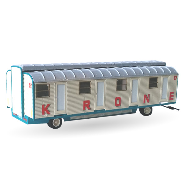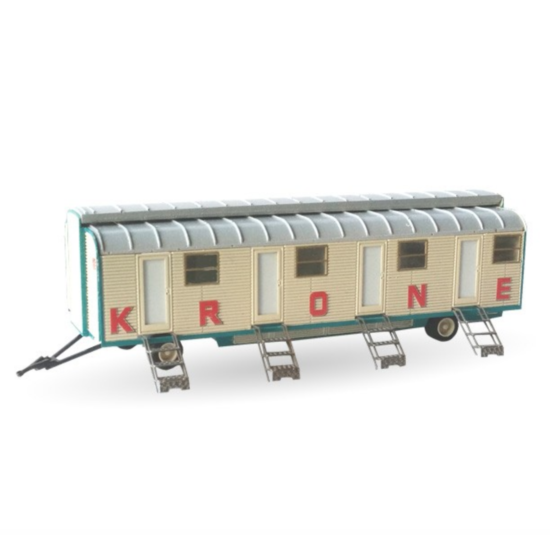 Unpainted kit of a Circus Krone crew wagon #57/58 in scale 1:87 (H0) made of brass, plastic, resin parts. The kit includes chassis, weehlsets, decals,roof and staircases.