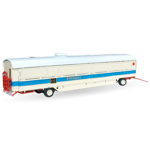 Der Bausatz ist ein typischer Schausteller Wohnwagen ausgestattet mit einer Veranda, 5 Erkern und 3 Eingängen. Der Wagen im Maßstab 1:87 wurde dem Original nachempfunden und ist mit vielen Details ausgestattet. So wurde das Dach inklusive Klimaanlage, sowie die Markise am Heck speziell gefertigt. An den 3 individuellen Treppen finden sich Geländer. Mit dem Bausatz lässt sich der Wagen im komplett aufgebauten Zustand darstellen. Die Fenster sind so konstruiert, dass sie vor der Montage lackiert und so sauber angebracht werden können. Beim Circus Roncalli dient der Wagen als Wohnwagen für den Betriebsleiter.