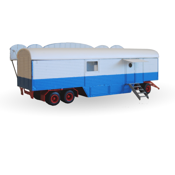 Unpainted kit of a Zirkus Probst office box wagon in scale 1:87 (H0) made of brass, plastic, resin parts. The kit includes chassis, weehlsets, decals, roof and staircases.